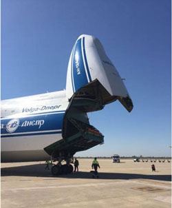 - La mole de los cielos (uno de los aviones más grandes del planeta) trae en su interior equipos para la usina termoeléctrica que está construyendo en Villa María la empresa MSU. El operativo de descarga tardará unas 5 horas.