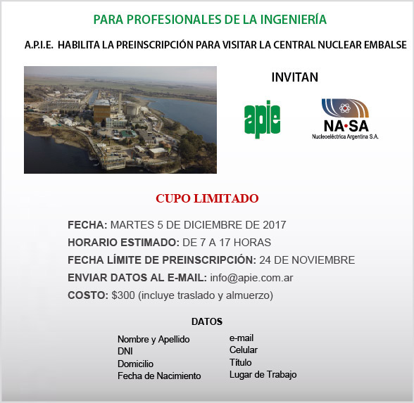Nov13 0 Visita a Central Nuclear Embalse | Diciembre 2017 – inscripciones abiertas Publicado Por apie