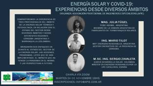El Grupo de Energia Solar (GES) coordino la Jornada sobre “Energía Solar y COVID-19” con la intención de tratar las experiencias desde diversos ámbitos. La misma se realizó el 24 de noviembre pasado, a las 18 hs, vía Plataforma digital Zoom.