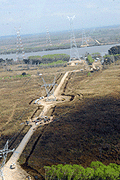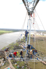 Hace mas de 24 años que no se encara en el país una obra de esta envergadura. Para soportar el peso propio y los esfuerzos del viento sobre los 12 conductores de gran diámetro que se elevan en la parte mas baja a un mínimo 56 metros sobre el nivel del agua, cada torre está asentada sobre 16 grandes pilotes de hormigón armado de 34 metros de profundidad, con un peso de hormigón de mas de 1.600 toneladas por torre