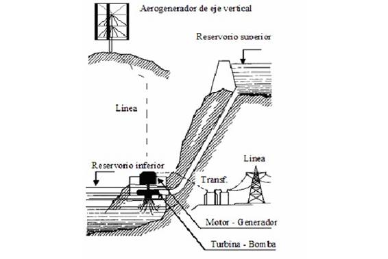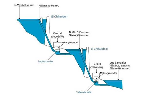 En la figura que sigue se muestra un perfil de cómo serían las centrales de bombeo a ubicar en la cuenca del río Neuquén, alimentadas por parques eólicos.