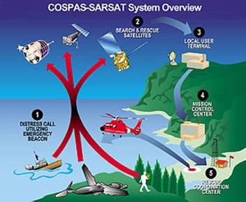 Como se puede observar en la figura, el sistema COSPAS-SARSAT se encuentra, en constante alerta, en espera de una señal de socorro producida por alguna baliza, cuando ésta sucede la red satelital la detecta y pone en alerta al centro de control, los cuales mediante triangulación satelital o información enviada por la balizas determina la posición donde se ha generado la señal de socorro, dicha información es enviada a los centro de búsqueda y rescate regionales para que comiencen con las tareas de salvamento.