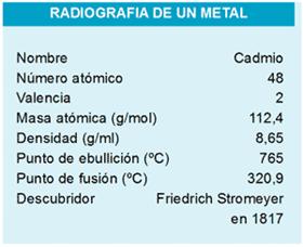 El cadmio es un metal azulado y tan blando que se lo puede cortar con un cuchillo. Lo descubrió en 1817 el químico alemán Friedrich Stromeyer, y le puso ese nombre porque lo extrajo de un mineral llamado cadmia (palabra que deriva del griego Cadmus, nombre del mítico fundador de la ciudad de Tebas). Si se ordenan los elementos químicos que componen la corteza terrestre según su abundancia, el cadmio ocupa la posición 65, un lugar intermedio.