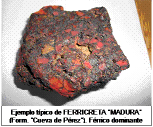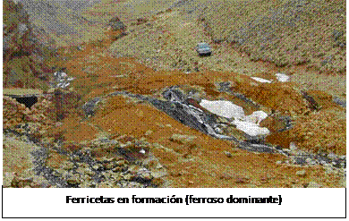 En esas aguas impegnadas de “sulfatos Ferrosos” (Hierro con valencia + 2), por el avance del proceso de la oxidación, el Hierro tienden a pasar al estado “Férrico” (valencia + 3), con lo cual la molécula se vuelve inestable y cualquier disminución de acidez (Ejemplo: una lluvia repentina o algún sector con rocas calcáreas reactivas) la descompone (“Hidroliza”) formándose los Oxidos Férricos hidratados de color marrón rojizo, a veces algo amarillentos (mas conocidos como “limonitas transportadas”) que van cementando las gravas y escombros modernos, formando las Ferricretas. Como fenómeno póstumo de los oxidos hidratados marrón-rojizos, se llega a producir deshidratación para formar Oxido ferrico anhidro (Rojo oscuro)