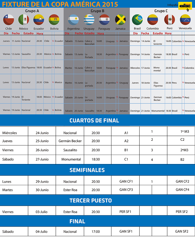 La Copa América 2015 será la XLIV edición de este torneo, la principal competencia futbolística entre selecciones nacionales de América del Sur y el más antiguo del mundo aún en vigencia. Organizado por la Conmebol, administrador del fútbol en Sudamérica y órgano del fútbol afiliado a la FIFA, el torneo se llevará a cabo por séptima vez en Chile entre el 11 de junio y el 4 de julio de 2015.