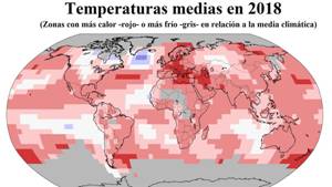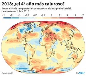 Un análisis consolidado de cinco de los mejores conjuntos internacionales de datos, realizado por la Organización Meteorológica Mundial (OMM), revela que la temperatura media mundial en superficie en 2018 superó aproximadamente en 1,0° grado Celsius (con un margen de error de ±0.13°C) a la de la era preindustrial (1850-1900). Se trata del cuarto año más caluroso jamás registrado.