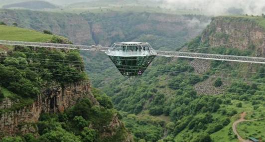 Un puente de cristal de 240 metros de largo, suspendido a 280 metros de altura, sorprende al mundo. Es que además de la suntuosidad de semejante construcción, se suma una barra en forma de diamante sobre el cañón Dashbashi, en el que funciona un bar de varios niveles. Se encuentra a dos horas en auto aproximadamente de Tiflis, la capital de Georgia.