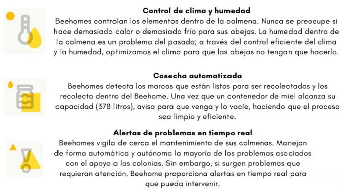 El producto consiste en una colmena impulsada por robótica de precisión, visión por ordenador e inteligencia artificial. Sus beneficios son muchos y muy prometedores. El uso de esta tecnología inteligente puede duplicar la capacidad de polinización y la producción de miel, a la vez que disminuye la tasa de mortalidad de las colonias.