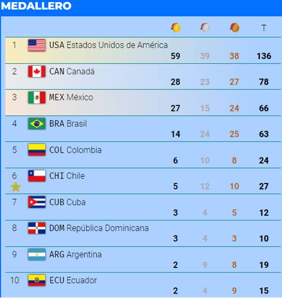 La canción oficial de estos Juegos —«A la cima»— fue interpretada por Ana Tijoux y Movimiento Original, cuya presentación en vivo fue seguida por Los Jaivas, la banda de rock fusión más longeva de Chile que aprovechó la inauguración de los Juegos para celebrar sus 60 años de historia musical. Hasta el 26 de Octubre el medallero es el siguiente: