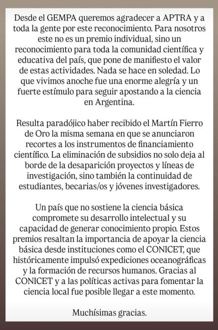 "Resulta paradójico haber recibido el Martín Fierro de Oro la misma semana en que se anunciaron recortes a los instrumentos de financiamiento científico. La eliminación de subsidios no solo deja al borde de la desaparición proyectos y líneas de investigación, sino también la continuidad de estudiantes, becarios y jóvenes estudiantes. Un país que no sostiene la ciencia básica compromete su desarrollo intelectual y su capacidad de generar conocimiento propio. Estos premios resaltan la importancia de apoyar la ciencia básica desde instituciones como el CONICET que históricamente impulsó expediciones oceanográficas y la formación de recursos humanos. Gracias al CONICET y a la políticas activas para fomentar la ciencia local fue posible llegar a este momento", detalló el mensaje.