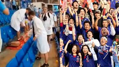 Los hinchas japoneses ayudaron a limpiar las tribunas tras el festejo ante Colombia –